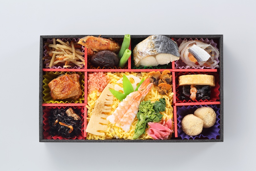 酢飯(米(国産))、さわら白醤油焼、きな粉きび団子、玉子焼、錦糸玉子、鶏照焼、柿入り大根生酢、えび南蛮漬け、昆布巻、きんぴらごぼう、菜の花のお浸し、人参油揚げ入りひじき煮、椎茸煮、焼き竹の子、えび酢漬、も貝煮、いんげん塩ゆで、おぼろ、れんこん酢漬、紅生姜、ままかり酢漬